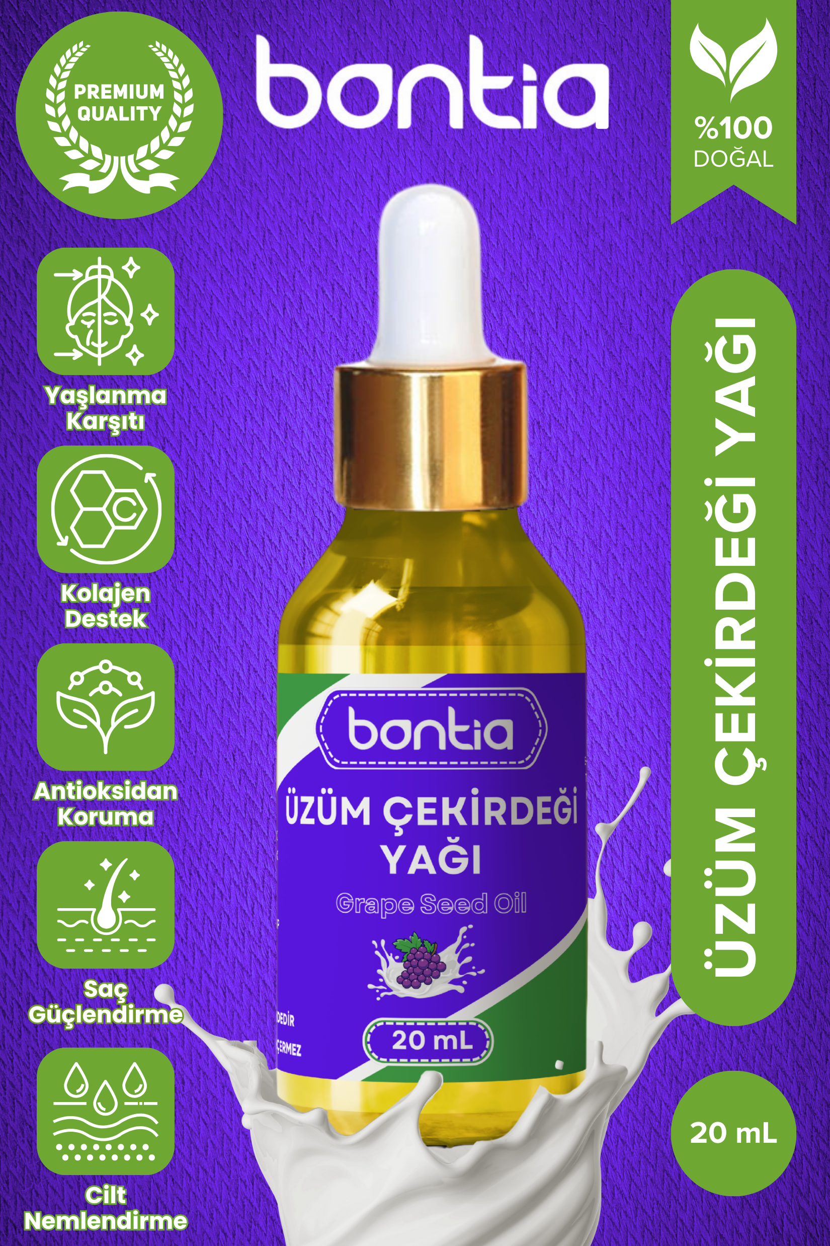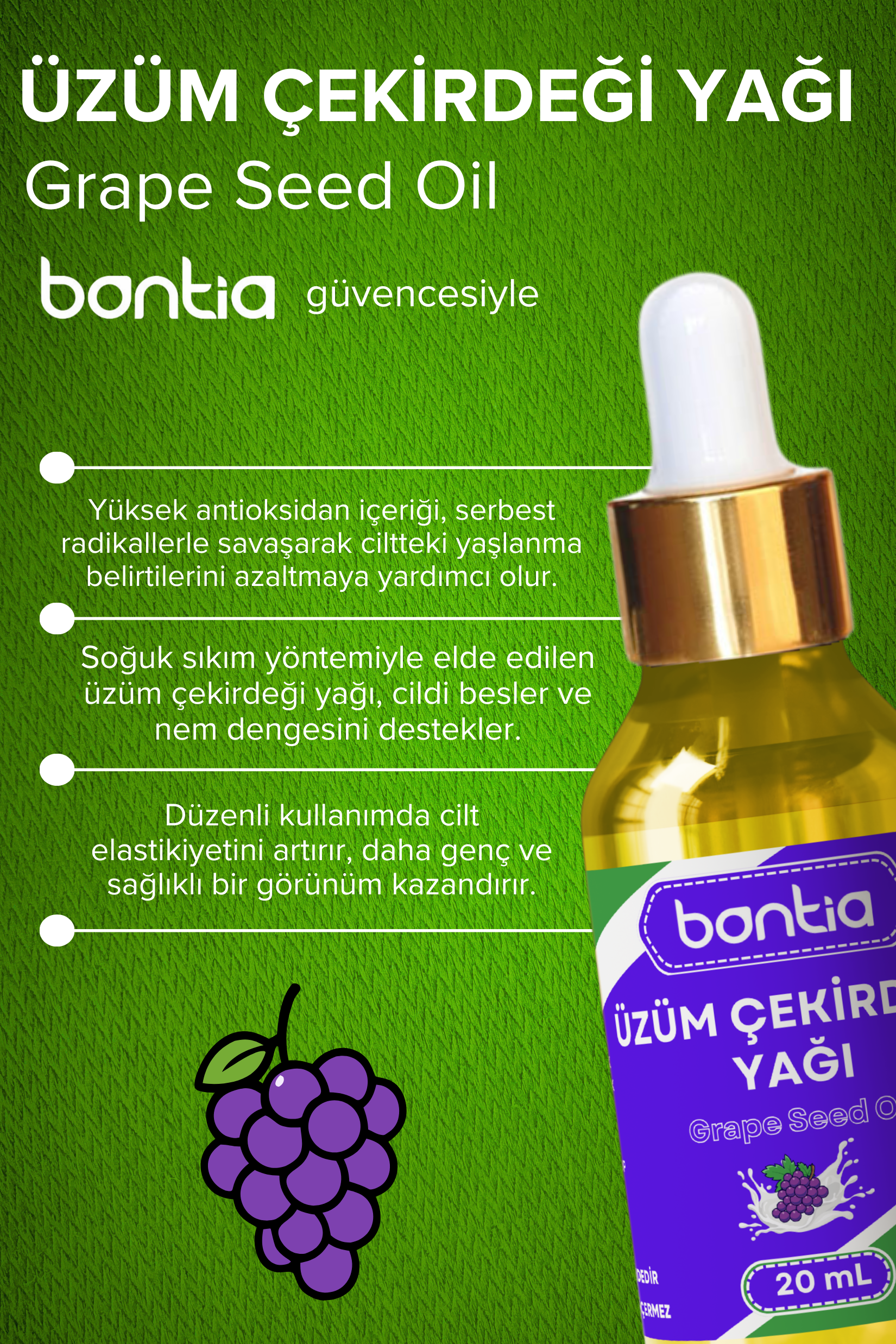 Bontia Üzüm Çekirdeği Yağı ile cildiniz ve saçlarınız için doğanın sunduğu lüksü keşfedin. Şimdi doğallığa ve güzelliğe yeni bir adım atın!